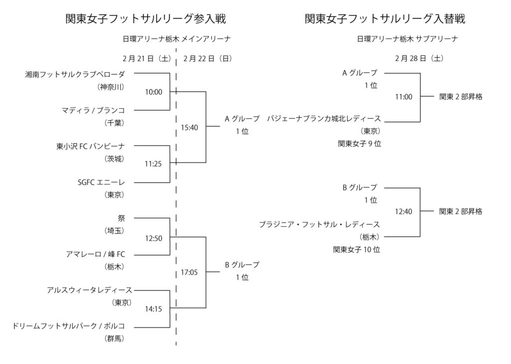 第17回関東女子フットサルリーグ参入戦・入替戦2026スケジュール 2026年1月28日 最終更新日時 : 2026年1月28日 deixa 2026年2月21日(土)22日(日)日環アリーナ(栃木県)にて行われる第17回関東女子フットサルリーグ参入戦・入替戦2026のスケジュールをお知らせします! 第17回関東女子フットサルリーグ参入戦・入替戦2026スケジュール 会場 日環アリーナ〒321-0166栃木県宇都宮市西川田4丁目1−1 栃木県フットサルリーグ FacebookXBlueskyHatenaCopy